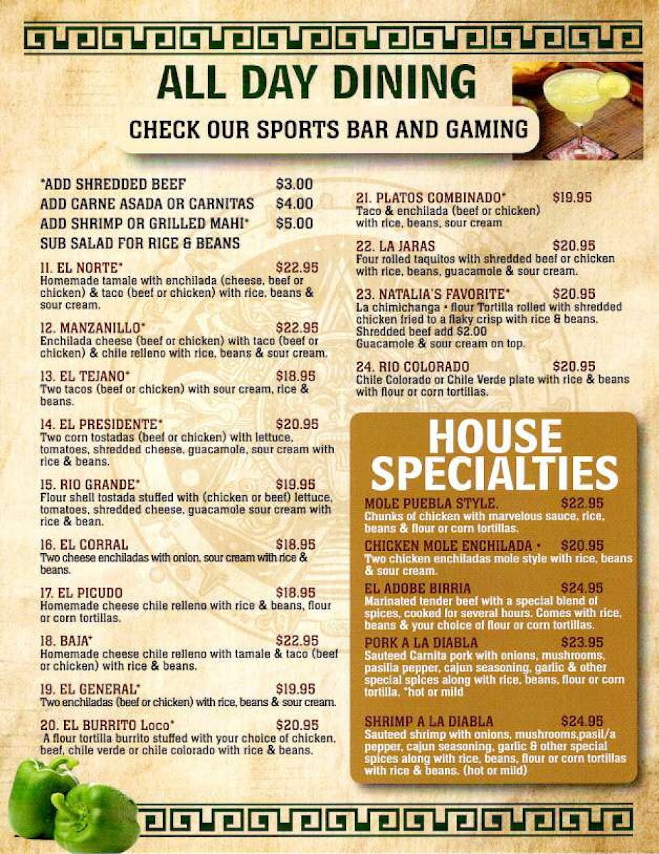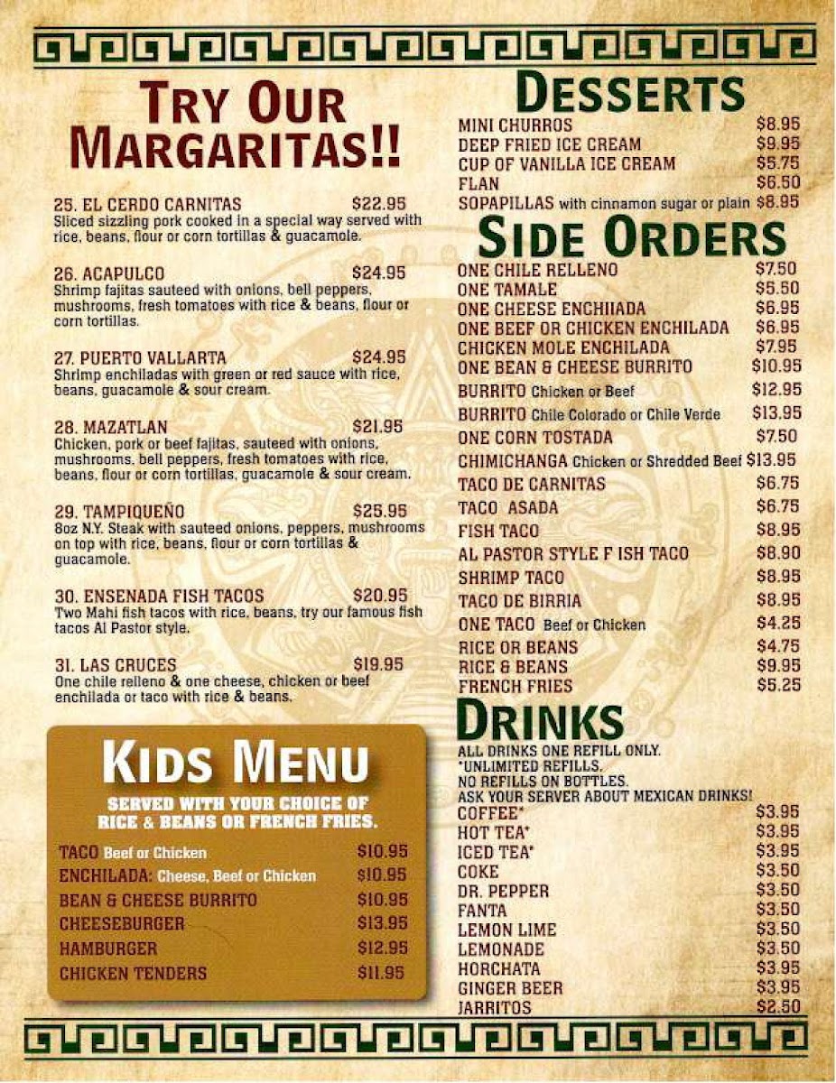 Chicken, pork or beef fajitas, sauteed with onions, mushrooms, bell peppers, fresh tomatoes with rice, beans, flour or corn tortillas, guacamole & sour cream.