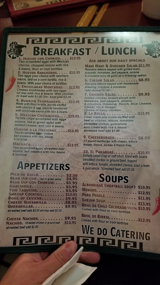 Tortilla chips scrambled with eggs, red or green salsa with melted cheese, with rice & beans.